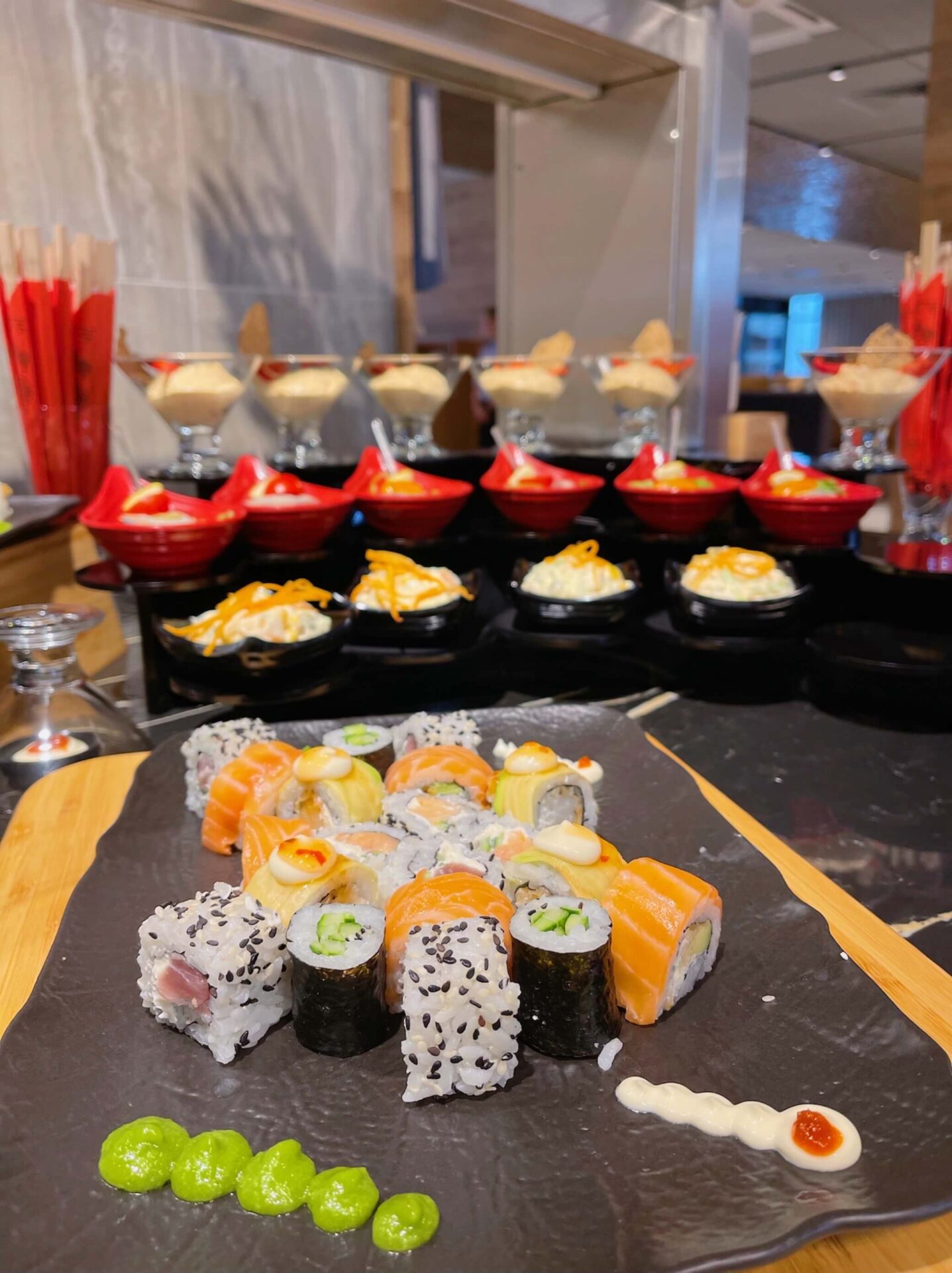 Има няколко ресторанта – основният работи за закуска, обяд и вечеря. През целия ден е отворен и друг за бърз снак, но ако влезеш в него, ще разбереш, че си е съвсем ресторант, приготвят ти храната на място + имаш богат избор от сандвичи, сладкиши, плодове и любимото за мен деконстриурано суши, както аз реших да го наричам. Всеки ден е различно: с риба тон, сьомга, скариди, бяла риба и тн. Наличен е и по-висок клас ресторант, който можеш да посетиш след резервация и е включен в цената. Съвсем близо е до морето и гледката е запленяваща. Чудесна и за снимки 🙂 Сладолед имаш цял ден, защото се оказа, че това е важно не само за децата, но и за доста възрастни.